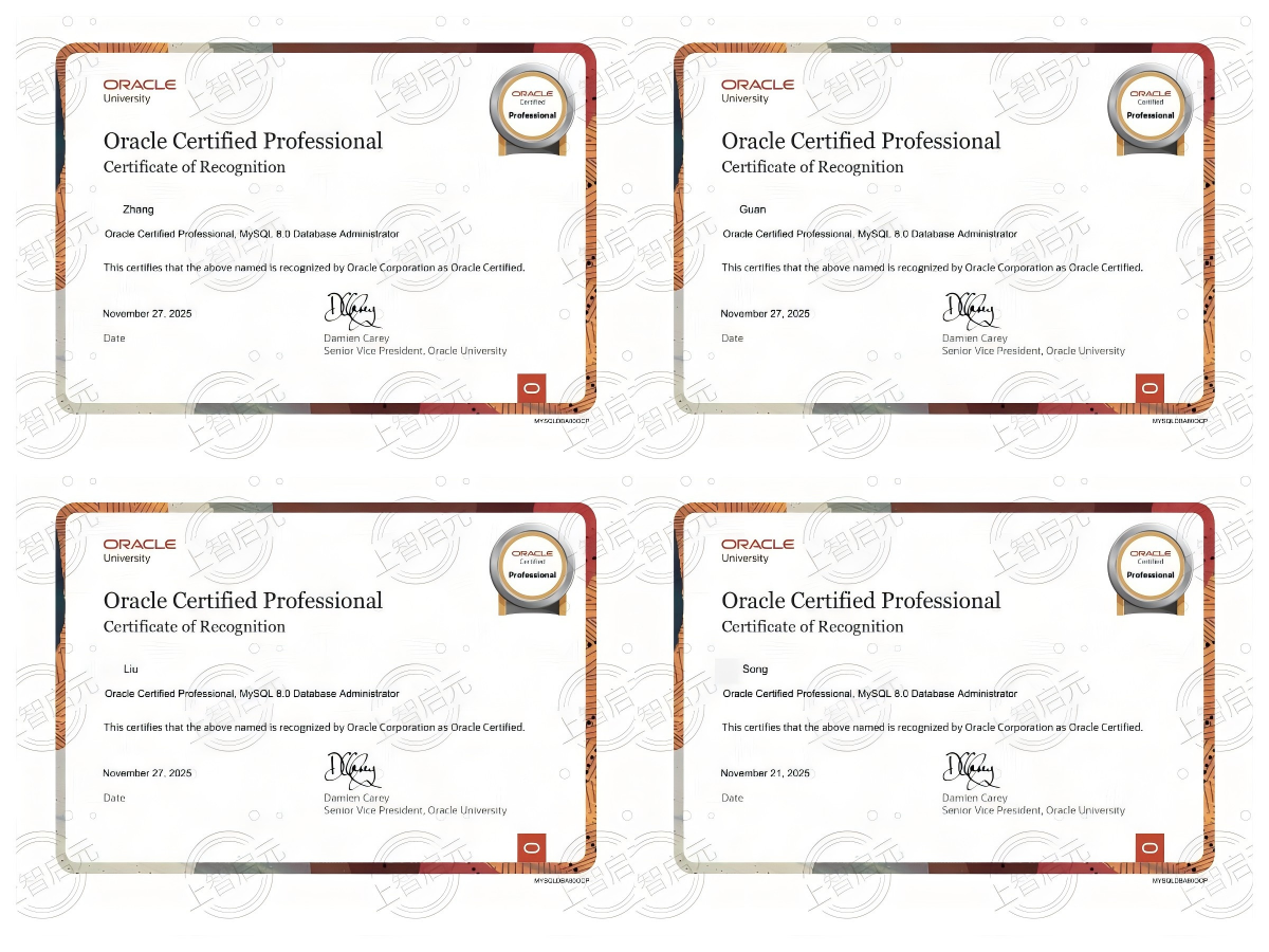 恭喜上智启元刘*、管*、宋*、张*同学11月27日获得MySQL 8.0 认证!题库稳定!