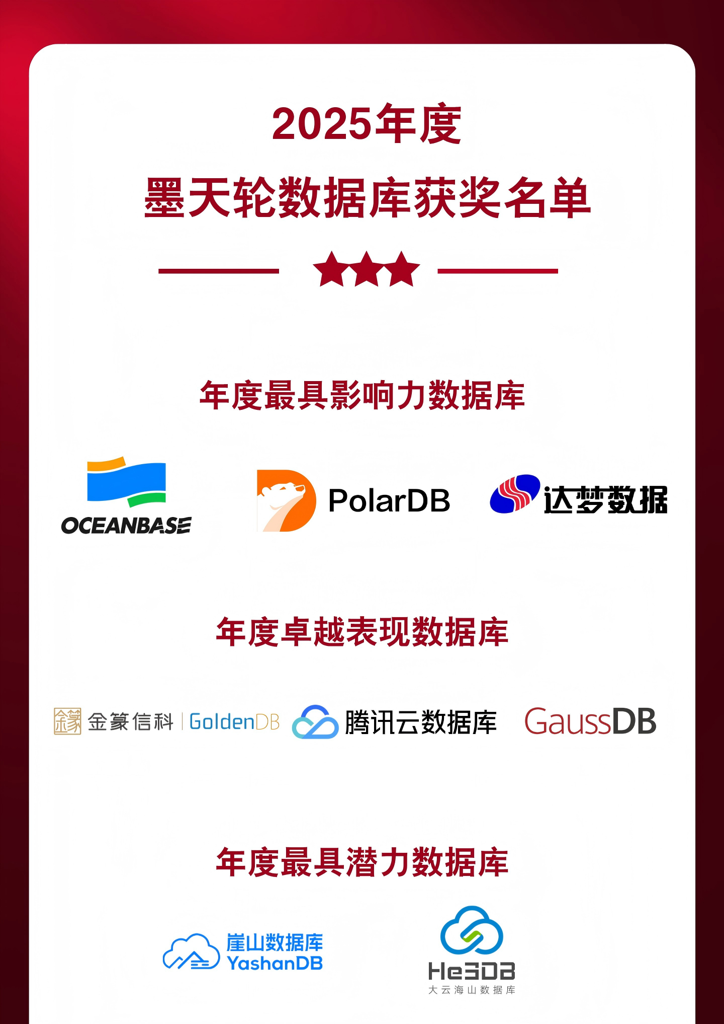 三、见证荣耀时刻,2025年度数据库奖项揭晓