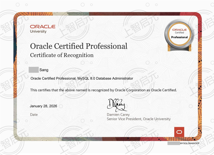 恭喜上智启元桑**同学1月28日获得MySQL 8.0 认证!题库稳定!